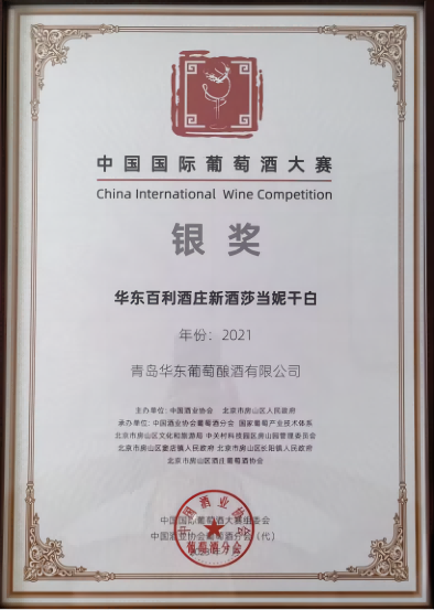 華東莊園新酒薏絲琳干白、華東百利酒莊新酒莎當(dāng)妮兩款產(chǎn)品榮獲中國(guó)國(guó)際葡萄酒大賽銀獎(jiǎng)